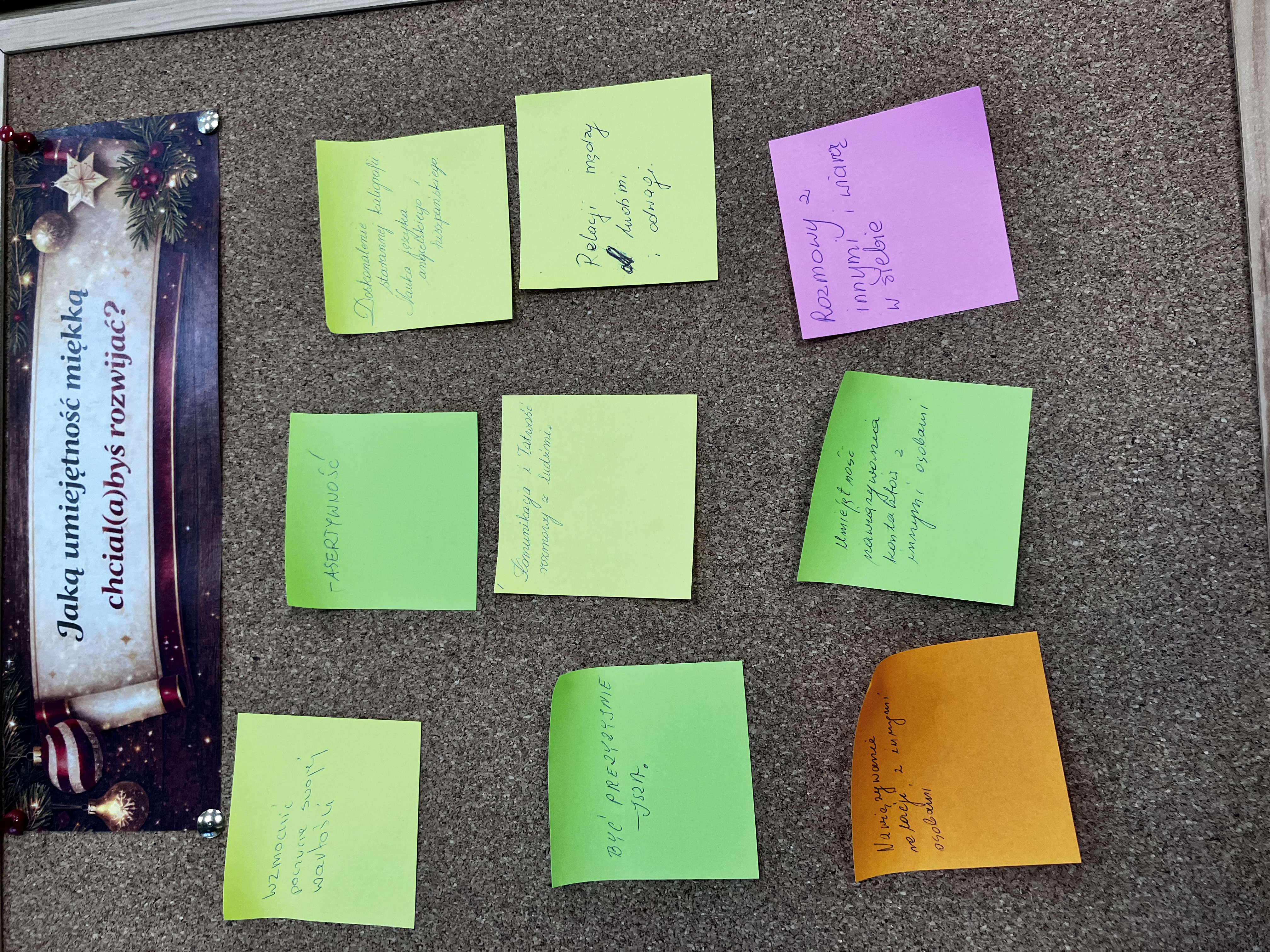 Jednym z ważniejszych elementów spotkania była rozmowa o tym, czym właściwie są kompetencje miękkie. Na początku dla części uczestników samo pojęcie nie było oczywiste, a wskazanie własnych mocnych stron czy obszarów do rozwoju okazało się trudniejsze niż mogło się wydawać. W pierwszej części warsztatów łatwiej było im mówić o innych osobach niż o sobie. Z czasem jednak, dzięki swobodnej atmosferze i rozmowom towarzyszącym wspólnej pracy, zaczęli trafniej opisywać własne cechy, zauważać swoje atuty i wskazywać to, co chcieliby w sobie wzmacniać.